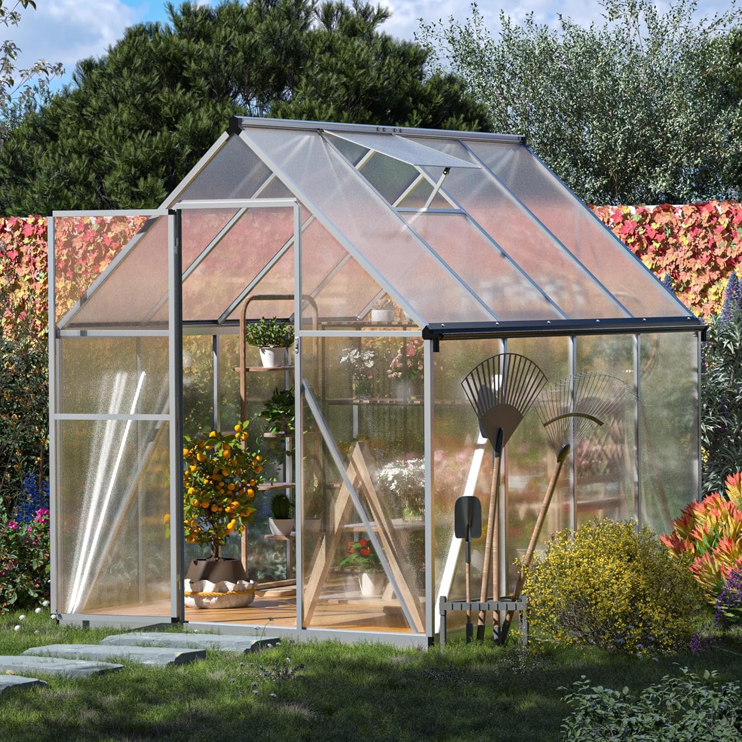 Image 1.1: The HOGYME 6x7.5 FT Greenhouse situated in a vibrant garden, showcasing its transparent polycarbonate panels and aluminum frame.